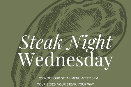 Our midweek steak night offers 25% off a selection of our top quality steaks. Personalised to your tastes, we give you the choice of sides and sauces to really create that meal you've been waiting for.